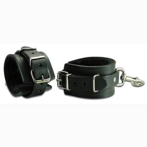 6cm wide, strong black belt hide restraints for wrists and ankles, padded, lined with dura-suede or fleece, heavy roller buckles for adjustment, joined by swivel clips