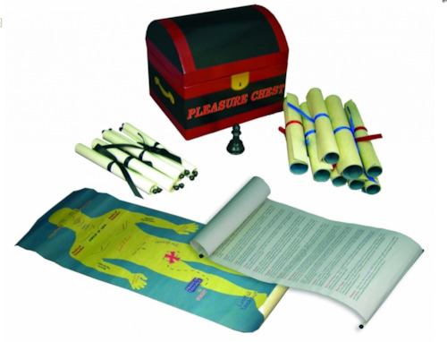 Aarrgghh Matey! You and yer wench best be battenin' down the hatrches. This here chest contains all ye scallywags need for many evevenings of carnal pillaging. Follow one of the eight pleasure maps and travel around the exotic island that is yer lover's body in search of the secret bounty. Be a thorough and adventuresome pirate and the treasure at the end of yer journey be plentiful. But, be careful, if ye draw yer sword too quickly ye may end up sleepin' with the fishes!