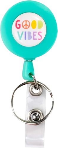 Brighten up someone's day with this fun badge reel that reads, "Good Vibes".