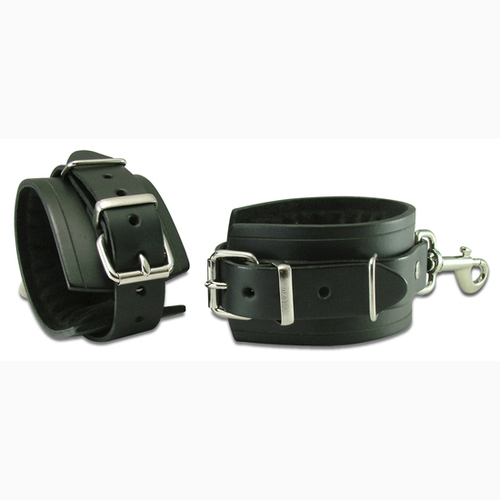 6cm wide, strong black belt hide restraints for wrists and ankles, padded, lined with dura-suede or fleece, heavy roller buckles for adjustment, joined by swivel clips